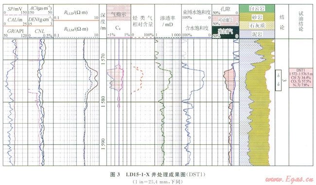 圖3顯示LDl5-1-X井1572~1577m段第2道中子密度出現(xiàn)交會(huì),第3道電阻率增大,第5道孔隙度差、比值識(shí)別法出現(xiàn)明顯的氣層“包絡(luò)”特征,第8道測(cè)井計(jì)算的含水飽和度與束縛水飽和度幾乎重合,含水飽和度大致為30%,第6道為該方法定量計(jì)算出的烴類氣相對(duì)含量,大概在40%左右,DST測(cè)試證實(shí)該層甲烷含量為34.4%,測(cè)試的結(jié)果與定量計(jì)算的結(jié)果相近。