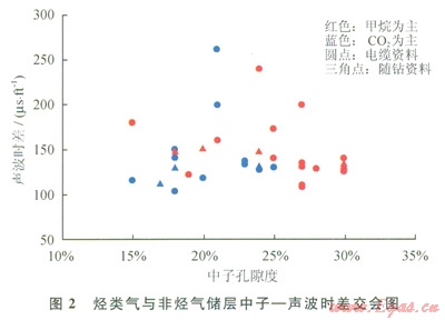 根據(jù)上述分析,采用交會(huì)圖技術(shù)研究了兩者在測(cè)井響應(yīng)上的差別。在樂東l5-1/22-1研究區(qū)選取了經(jīng)測(cè)試、電纜測(cè)試取樣或試生產(chǎn)證實(shí)含量相對(duì)比較高的甲烷或二氧化碳層段(表1),并定義甲烷含量高于50%的氣層為以甲烷為主的氣層,否則為以非烴為主(CO2為主)的氣層,然后利用這些層段的測(cè)井資料分別作出了密度一中子、密度一聲波交會(huì)圖(圖1、2)。從圖l、2中可以看出:烴類氣與二氧化碳?xì)怏w在測(cè)井響應(yīng)值上是存在一定差別的,從而可以通過這種差異來區(qū)分烴類氣與二氧化碳?xì)鈱?sup>[10]。