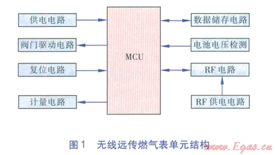 MCU作為無線遠傳燃氣表的主控單元,負責所有流程控制及數據處理。供電電路為各單元供電,保證各單元正常工作。閥門驅動電路為表具閥門的開關裝置供電,保證閥門正常啟閉。復位電路提供軟啟動控制,使無線遠傳燃氣表能從異常狀態(tài)恢復至正常狀態(tài)。計量電路負責用氣量的計量。數據儲存電路實現(xiàn)計量數據的儲存功能。電池電壓檢測電路定時檢測電池的電壓,當電池電壓低于設定值時,及時提醒用戶更換電池。RF電路負責數據的傳輸,RF供電電路為RF電路供電,保證RF電路的正常工作。