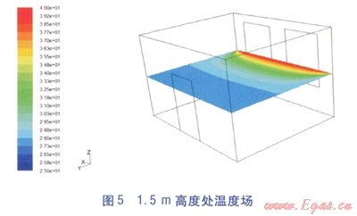 由圖3、4可知,靠近頂面的空氣溫度較低,且垂直方向溫度梯度較大,而距地面l.5m范圍內的垂直方向溫度梯度較小。由圖3、5可知,靠近外窗的空氣溫度較高,但水平方向上的溫度梯度并不大。