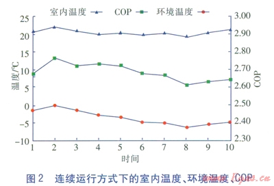 連續(xù)運行方式的實驗時間為l個月,每天運行24h,每小時監(jiān)測記錄一次。以每3天為單位取室內(nèi)溫度、COP、環(huán)境溫度平均值,結(jié)果見圖2。其中橫坐標值1代表實驗的第l~3天,2代表實驗的4~6天,依此類推。在此運行模式期間,平均室外溫度為-3.47℃,最低日平均溫度為-6.6℃,最高日平均溫度為0.0℃,太陽輻射平均日總量為2353W/m2,集熱器平均日集熱總量為l411.8W/m2,室內(nèi)溫度在19.2~22.7℃范圍內(nèi)變化(平均達21.15℃),系統(tǒng)的平均COP達2.689,COP最低為2.614,最高為2.782。從圖2可知,系統(tǒng)連續(xù)運行時的供暖溫度始終在人體舒適的溫度范圍內(nèi)波動,但是系統(tǒng)的COP值較小,說明能耗還可以進一步降低。