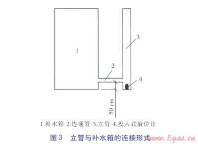 增設(shè)立管與補水箱底部連通,將投入式液位計沉入立管底部,具體連接形式見圖3。由于補水箱底部的水溫較低,因此投入式液位計所在位置的水溫也較低,能基本滿足其設(shè)計溫度工作。