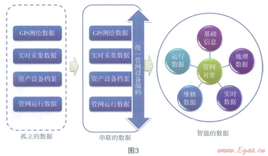 如何才能把不同種類的數(shù)據(jù)利用物理或者邏輯的方式集成起來(lái)?答案是通過(guò)統(tǒng)一的管網(wǎng)設(shè)備設(shè)施編碼,它同樣是智能燃?xì)饩W(wǎng)標(biāo)準(zhǔn)化建設(shè)體系里面的重要內(nèi)容。北京燃?xì)饧瘓F(tuán)從多年前就開(kāi)始管網(wǎng)設(shè)備設(shè)施和物資體系的標(biāo)準(zhǔn)化工作,如存GIS地理信息系統(tǒng)里面就已經(jīng)采用了l5位的統(tǒng)一管網(wǎng)編碼,但大部分業(yè)務(wù)系統(tǒng)設(shè)備設(shè)施的編碼體系還不完全一致,需要轉(zhuǎn)換或者對(duì)照才能把這些業(yè)務(wù)數(shù)據(jù)關(guān)聯(lián)起來(lái)。圖3足數(shù)據(jù)從串聯(lián)到完全關(guān)聯(lián)的過(guò)程。