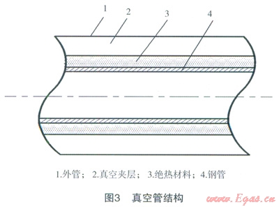 LNG槽車到站后,通常通過低溫泵法或增壓器法對槽車內(nèi)LNG增壓后將LNG卸入儲罐內(nèi)。不論采用哪種方法,LNG必須通過低溫管道進行輸送,在輸送過程中,LNG將吸收外界環(huán)境熱量而氣化,產(chǎn)生BOG。為了減少BOG的產(chǎn)生,通常利用兩種方法對低溫管道進行保冷處理,即絕熱材料包覆法和真空管法,這兩種方法結(jié)構(gòu)如圖2、3所示[5]。
