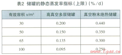 (2)設(shè)計文件應(yīng)對LNG儲罐提出明確的保冷指標要求。不論是真空粉末絕熱儲罐還是高真空多層絕熱儲罐對保冷都應(yīng)有明確的要求,即某體積的儲罐都應(yīng)對應(yīng)相應(yīng)的真空度和靜態(tài)蒸發(fā)率,超過這些數(shù)值指標就達不到保冷效果,蒸發(fā)氣體產(chǎn)生量就會增加,應(yīng)及時抽真空處理或采取其他措施。綜合相關(guān)規(guī)范和工程實踐,提出儲罐的保冷指標要求,儲罐的封結(jié)真空度指標要求見表1,靜態(tài)蒸發(fā)率指標(上限)要求見表2。