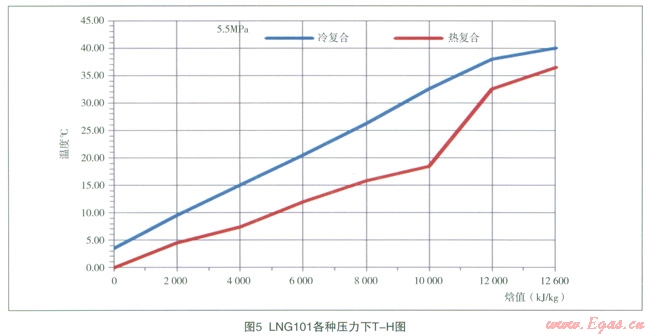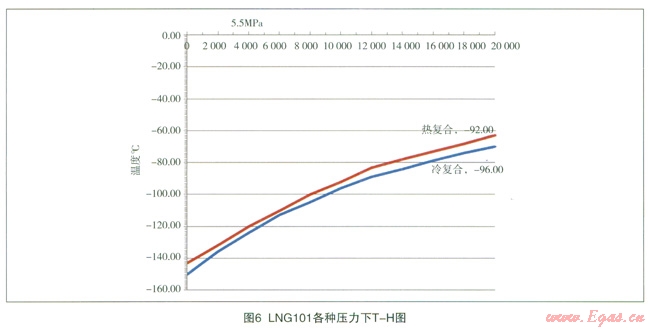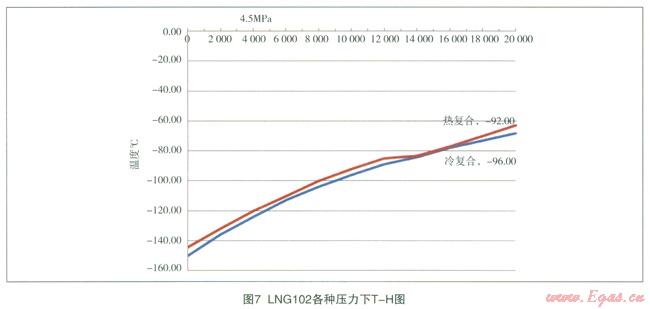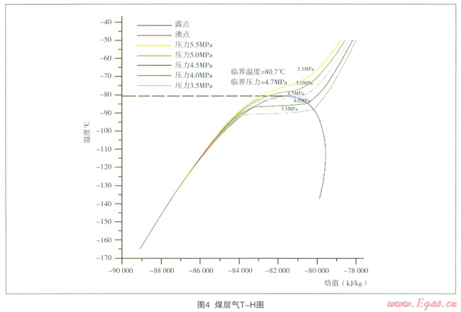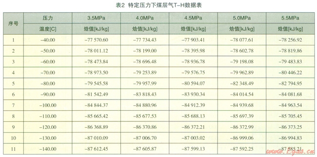 在特定壓力下,利用根據(jù)圖l建立的系統(tǒng)模型對(duì)煤層氣從初溫-40℃冷卻至-l40℃的過(guò)程中對(duì)煤層氣的T-H進(jìn)行模擬計(jì)算,結(jié)果詳見(jiàn)表2。