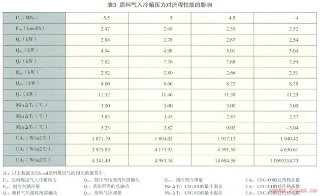 在煤層氣液化工藝中由于階式制冷工藝流程復(fù)雜,膨脹制冷工藝能耗偏高,混合制冷工藝逐步成為煤層氣液化領(lǐng)域的選擇趨勢(shì)。在混合制冷工藝中由于涉及的設(shè)備眾多,整個(gè)流程比較復(fù)雜,本文以某液化工廠流程原料氣進(jìn)冷箱的壓力對(duì)制冷劑的組分、制冷劑循環(huán)量、壓縮機(jī)功耗及冷卻水帶走熱量等性能參數(shù)的影響。從而通過(guò)合理選擇工藝參數(shù)使壓縮機(jī)的功耗降低,提高效率。