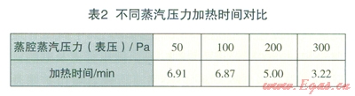測試樣機(jī)為隨機(jī)選取的一臺(tái)蒸箱,蒸汽壓力最高升至300Pa,測試過程中以水作為被加熱物體(代替食物),質(zhì)量為lkg的水放置在同一蒸腔內(nèi),壓力分別為50Pa、lOOPa、200Pa、300Pa做對比測試,被測水的溫升從起始溫度30℃被加熱到95℃,溫升為65℃.所需時(shí)間對比見表2。