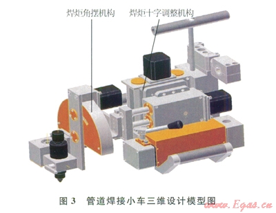 焊接小車主要由焊炬角擺機構與焊炬十字調整機構構成(圖3)。其中,焊炬角擺機構可實現(xiàn)焊炬最佳的角擺角度和擺動頻率,有效避免焊接過程中產(chǎn)生未熔缺陷;焊炬十字調整機構可實現(xiàn)焊炬上下位置的調整與相對于焊縫寬度的左右位置調整,以滿足管道焊縫不同位置焊絲與管壁的間距要求及寬度要求。