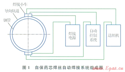 管道全位置自保護藥芯焊絲自動焊接系統(tǒng)(以下簡稱為自保藥芯焊絲自動焊接系統(tǒng))主要由安裝焊炬的焊接小車、導向軌道、自動控制系統(tǒng)、焊接電源及送絲機等組成(圖1)。