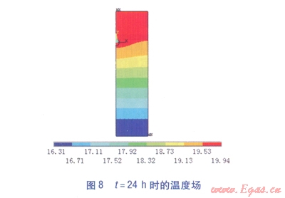通過有限元軟件模擬了管道氣密性試驗(yàn)過程24h內(nèi)的溫度場分布,不同時(shí)刻的溫度場分布見圖3~8,t為模擬的時(shí)間,云圖下方彩色標(biāo)尺的顏色深淺表示溫度的高低,數(shù)值表示溫度值,單位為℃。