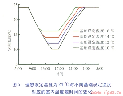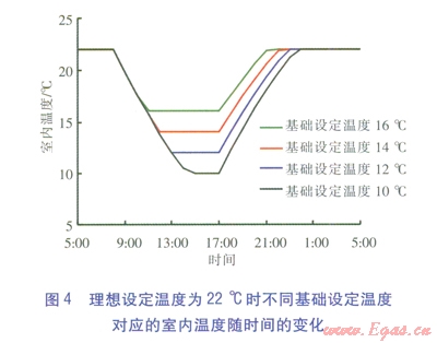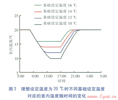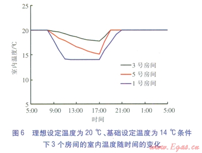 由圖6可知,在理想設(shè)定溫度為20℃、基礎(chǔ)設(shè)定溫度為l4℃條件下,房間3、5在人員外出的時(shí)間內(nèi),室內(nèi)溫度未能降至l4℃。尤其是位于建筑內(nèi)部的房間3,17:00室內(nèi)溫度僅降低至l8℃。對于這種房間,基礎(chǔ)設(shè)定溫度無淪是小于還是等于18℃,產(chǎn)生的效果相近。相對于房間1,房間3、5的室內(nèi)溫度下降時(shí)間較長,溫度回升時(shí)間較短。