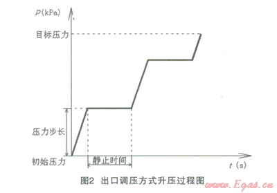 (2)自動調(diào)壓的出口調(diào)壓功能。通過設(shè)置壓力步長、靜止時間、目標壓力等狀態(tài)參數(shù)在站控室的控制面板上進行壓力調(diào)整,通過出口壓力的反饋值調(diào)整比對,最終達到設(shè)定的出口壓力。其調(diào)整的過程見圖2。
