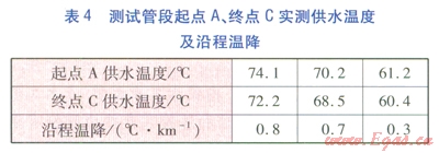 對(duì)測(cè)試管段的起點(diǎn)A、終點(diǎn)C的供水溫度進(jìn)行了3次測(cè)量,計(jì)算供水沿程溫降。實(shí)測(cè)供水溫度及沿程溫降見(jiàn)表4。由表4可知,隨著供水溫度的提高,供水沿程溫降呈上升趨勢(shì)。