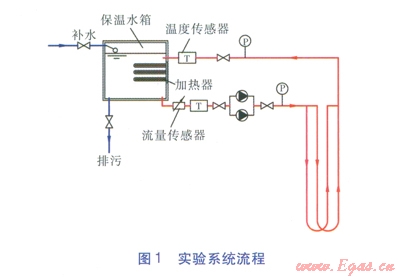實驗系統(tǒng)流程見圖l。地埋管換熱器進水溫度恒定在30℃,水的流速基本穩(wěn)定在0.5m/s。鉆孔深度l00m,地埋管換熱器布置為雙U形,采用PE管,外直徑為32mm,壁厚為3mm。在地埋管換熱器進出水管道上分別設置溫度傳感器,并在鉆孔距地面0.5、2.5、4.5、9.5、14.5、24.5、44.5、64.5、94.5m處設溫度測點,測量土壤溫度。數(shù)據(jù)采集時間間隔為l0min,實測土壤初始平均溫度為l9.8℃。
