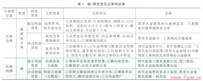 根據(jù)礁、灘所處的古地理位置,可以分為臺緣礁/灘和臺內(nèi)礁/灘,它們在發(fā)育位置、規(guī)模、形態(tài)和空間分布等方面有很大不同。塔里木盆地、四川盆地臺緣礁灘和臺內(nèi)灘均有大面積分布,是油氣勘探尋找的有利相帶,因此筆者將重點討論臺緣礁灘和臺內(nèi)灘在不同構(gòu)造背景下的發(fā)育特征。