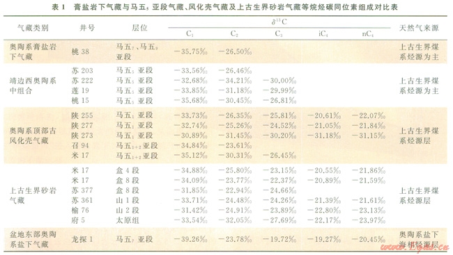 靖邊氣田西北側(cè)已有1口探井(桃38井),奧陶系馬家溝組馬五段地層保存齊全,在鉆穿馬五6亞段膏鹽巖層后,于馬五7、馬五9亞段白云巖中見到較好的含氣顯示(氣層距奧陶系頂面風化殼超過200m),后經(jīng)酸化改造、試氣獲得l2.91×104m3/d的較高產(chǎn)工業(yè)氣流,成為盆地內(nèi)首次在膏鹽巖下深層獲得工業(yè)氣流的探井,產(chǎn)層天然氣樣品的甲烷碳同位素值為-35.75‰,乙烷碳同位素值為-26.50‰,與盆地本部來源于上古生界煤系烴源巖的奧陶系頂部風化殼氣藏、上古生界砂巖氣藏、奧陶系中組合馬五5亞段氣藏等的天然氣烷烴碳同位素組成基本一致(表1)。這類煤系烴源氣藏的甲烷碳同位素值一般在-30‰~-36‰之間,乙烷碳同位素值為-23‰~-30‰之間[18-22],證實了膏鹽巖下圈閉的有效性及氣源主要來自上古生界煤系烴源巖的基本成藏特征。另外,近期通過靖邊氣田勘探早期鉆入膏鹽巖下深層的探井復查分析,也發(fā)現(xiàn)l0余口探井在膏鹽巖下有一定的含氣顯示,但由于當初勘探重點是奧陶系頂部的馬五1+2亞段風化殼氣藏,對馬五5亞段及以下的中下組合含氣層系認識不足,加之個別井試氣效果不理想,也就沒有進一步深入勘探之。
