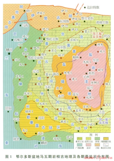 鄂爾多斯盆地奧陶系馬家溝組發(fā)育巨厚的膏鹽巖沉積地層,按照沉積旋回劃分,其主要分布在下奧陶統(tǒng)馬家溝組馬一、馬三、馬五段3個海退期沉積層序中[1-3]。其中馬五段是馬家溝組最后一期蒸發(fā)旋回形成的沉積地層,內(nèi)部又可進一步細分為馬五10、馬五8、馬五6、馬五4亞段等4個主要的膏鹽巖層段,尤以馬五6亞段的膏鹽巖分布范圍為最廣,面積約5×l04km2,主要分布在盆地中東部的陜北米脂鹽洼沉積相區(qū)(圖1)。因而,通常所言奧陶系鹽上和鹽下地層均以馬五8亞段為界劃分。