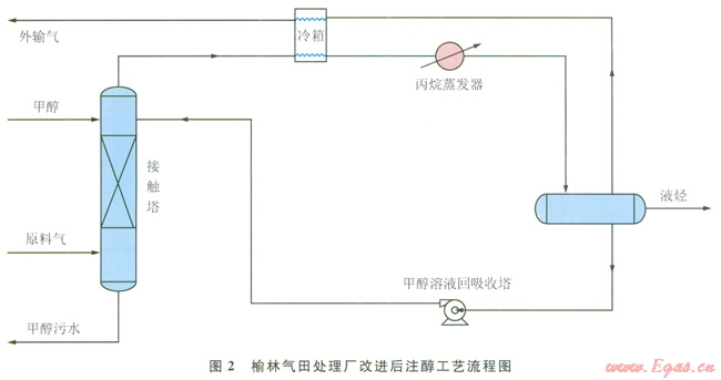改進(jìn)后的注醇工藝甲醇溶液回流接觸塔形成了循環(huán)注醇過(guò)程,實(shí)際上,補(bǔ)充注入的醇是被天然氣帶止而損失的一小部分甲醇,這樣便大大提高了甲醇的利用率。