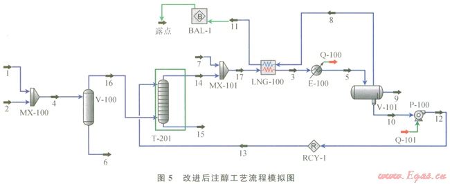 圖5為采用HYSYS軟件對(duì)改進(jìn)后注醇工藝流程模擬示意圖。