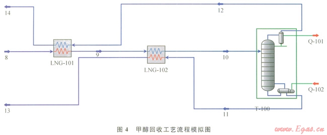 圖3、4分別為采用HYSYS軟件對(duì)現(xiàn)用注醇工藝和甲醇回收工藝流程模擬示意圖。