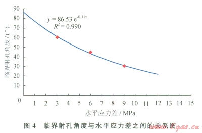 利用本壓裂模擬實(shí)驗(yàn)結(jié)果,可回歸出產(chǎn)生非對(duì)稱多裂縫系統(tǒng)的臨界射孔角度和水平應(yīng)力差的相互關(guān)系曲線(圖4)。當(dāng)水平應(yīng)力差和定向射孔方位角的坐標(biāo)落在藍(lán)色臨界線的左下側(cè)時(shí),人工水力裂縫會(huì)沿定向射孔方向起裂,形成一條基本對(duì)稱的雙翼平直裂縫或雙翼彎曲裂縫;當(dāng)水平應(yīng)力差和定向射孔方位角的坐標(biāo)落在藍(lán)色臨界線的右上側(cè)時(shí),人工水力裂縫會(huì)沿著最大水平地應(yīng)力方向起裂,產(chǎn)生一條穿過(guò)微環(huán)面的雙翼平直裂縫;當(dāng)水平應(yīng)力差和定向射孔方位角的坐標(biāo)正好落在藍(lán)色臨界線上時(shí),人工水力裂縫可能沿著定向射孔方向和最大水平地應(yīng)力方向多點(diǎn)同時(shí)起裂,形成非對(duì)稱多裂縫系統(tǒng)。該預(yù)測(cè)結(jié)果與本文參考文獻(xiàn)[3]的有限元模擬計(jì)算結(jié)果比較一致。運(yùn)用該圖可以用來(lái)預(yù)測(cè)定向射孔水力壓裂裂縫形態(tài),為現(xiàn)場(chǎng)壓裂施工提供參考。但鑒于實(shí)際地層因素和完井因素的影響,實(shí)際的臨界射孔角度可能會(huì)有所變化。