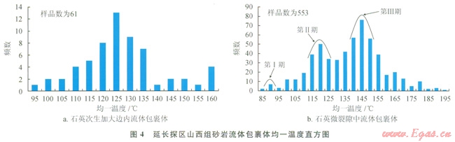 流體包裹體分析是研究油氣運移充注期次的有效手段。選取山西組22個砂巖樣品進行流體包裹體分析,根據(jù)鏡下觀察結果,流體包裹體主要分布在石英次生加大邊及石英顆粒微裂隙,其中砂巖石英次生加大邊內流體包裹體均一溫度(圖4-a)分布在94.2~159.3℃,主峰溫度區(qū)間位于115~135℃;砂巖石英微裂隙中流體包裹體均一溫度(圖4-b)分布在82.7~193.8℃,并分為3個溫度區(qū)間,分別是80~95℃、95~130℃、l30~195℃,主峰溫度區(qū)間位于85~90℃、ll0~125℃和l35~155℃。石英加大邊內流體包裹體的均一溫度主峰區(qū)間與石英裂縫中的第Ⅱ期流體包裹體均一溫度的主峰溫度區(qū)間相近,應該屬于同一期酸性流體活動。