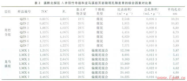 不同類型的干酪根對(duì)頁(yè)巖微觀孔隙發(fā)育程度有著一定的影響,干酪根由混合型到腐泥型,泥頁(yè)巖的比表面積和孔體積均減小[26]。選擇有機(jī)碳含量、熱演化程度等條件相近,干酪根類型不同的幾組樣品,通過(guò)對(duì)比發(fā)現(xiàn)。該區(qū)也具有相似的特征和變化規(guī)律。即偏腐泥混合型干酪根頁(yè)巖中的微觀孔隙的比表面積和孔體積大于含腐泥型干酪根頁(yè)巖中微觀孔隙的比表面積和孔體積(表2)。其原因可能是偏腐泥混合型干酪根有來(lái)源于較高等的浮游生物,與低等菌藻類生物相比,其內(nèi)部結(jié)構(gòu)較大且復(fù)雜,致使頁(yè)巖微觀孔隙空間也有所增大,進(jìn)而對(duì)頁(yè)巖的比表面、孔體積等也造成了一定的影響。但是,由于地質(zhì)層位不同,所經(jīng)歷的地質(zhì)作用存在差異,影響因素眾多,這種簡(jiǎn)單的表象對(duì)比結(jié)果僅作參考,分析的原因是值得借鑒的。