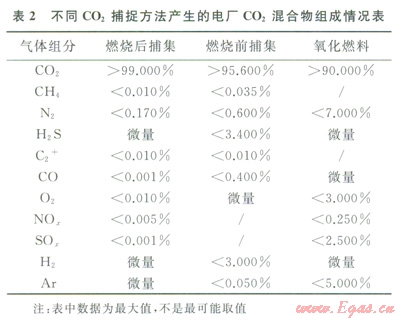 電力行業(yè)是主要的CO2排放源。電廠CO2捕捉的3個主要方法是:①燃燒前捕集;②燃燒后捕集;③氧化燃料。使用不同CO2捕捉方法所產(chǎn)生的CO2混合氣體雜質(zhì)含量也不同。采用不同CO2捕捉方法得到的典型CO2混合氣體組成情況見表2[2]。CO2混合氣體的組分含量取決于多個因素,如果對其他化合物不進行純化和聯(lián)合捕捉就會達到表2中的最大濃度。通常最終CO2混合氣體中的H2S和SO2含量遠低于表2所示的最大濃度。