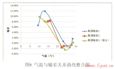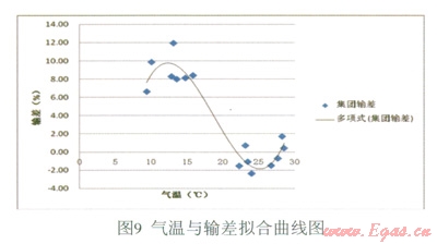 由表l的計算結(jié)果可知,擬合效果很好。因此,可得到回歸方程:y=0.011x3-0.621x2+10.260x-43.096(注:x為氣溫單位℃,y為百分數(shù)表示的輸差),其曲線如圖9所示: