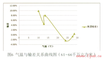 (3)在現(xiàn)有數(shù)據(jù)基礎(chǔ)上,暫未發(fā)現(xiàn)供氣量與輸差之間的明顯函數(shù)關(guān)系。但是,從圖8觀察發(fā)現(xiàn),輸差曲線1、2、3(修正)對應(yīng)的供氣量依次為:41—45、56—60、61—66,單位千萬立方米。隨著供氣量的大幅上升,輸差曲線呈向左下方平移的趨勢。即溫度等其他條件一定的情況下,隨著供氣量的大幅增加,輸差有減小的趨勢。初步分析,可能是由規(guī)模效應(yīng)導致。此推斷是否成立有待進一步的研究,可做為下一研究課題。