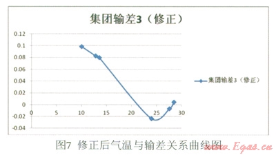 由圖9可知,輸差存在極值,不會永遠增大或減小。對回歸方程求導可得:y=0.033x2-1.242x+10.260,令其等于零則可以得出函數(shù)的極值為:x1=12.35,x2=24.95。將x代入回歸方程可以求得對應(yīng)的輸差分別為:y1=9.62,y2=2.84。因此,輸差的極大值應(yīng)該出現(xiàn)在12℃左右為9.62左右,極小值應(yīng)該出現(xiàn)在25℃左右為-2.84左右。