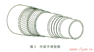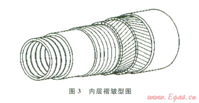 柔性管道主要分為兩種類型:內(nèi)層平滑型(圖2)和內(nèi)層褶皺型(圖3)。主要區(qū)別是:前者與介質(zhì)接觸的最內(nèi)層材料為塑性管道,而后者最內(nèi)層材料為金屬互鎖層。內(nèi)層褶皺型柔性管可以應(yīng)用于油田和氣田,通球時(shí)不會(huì)對內(nèi)壁造成影響,而內(nèi)層平滑型應(yīng)用于油田,氣田應(yīng)用較少,在通球和管線內(nèi)出現(xiàn)真空工況時(shí),需要避免外力對內(nèi)壁的破壞。除了最內(nèi)層的區(qū)別外,其他各層材料及功能都是相似的,