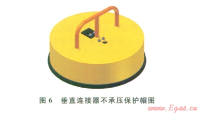 垂直連接器的公接頭一般安裝在管匯/采油樹上,母接頭裝在跨接管上、安裝時(shí)與公接頭對接(圖4、5)。水下連接器保護(hù)帽分為不承壓和承壓兩種形式(圖6、7)。不承壓保護(hù)帽對水下連接器的公接頭起到保護(hù)作用,也可隨著接頭安裝到水下,一般建議在水下的停留時(shí)間不超過42d。承壓保護(hù)帽可用于長期的公接頭保護(hù)(期限與公接頭使用壽命相同),根據(jù)密封形式的不同,也可用做隔斷使用,即橡膠密封的承壓保護(hù)帽可用作二級隔斷使用,金屬密封的承壓保護(hù)帽可用作一級隔斷使用。