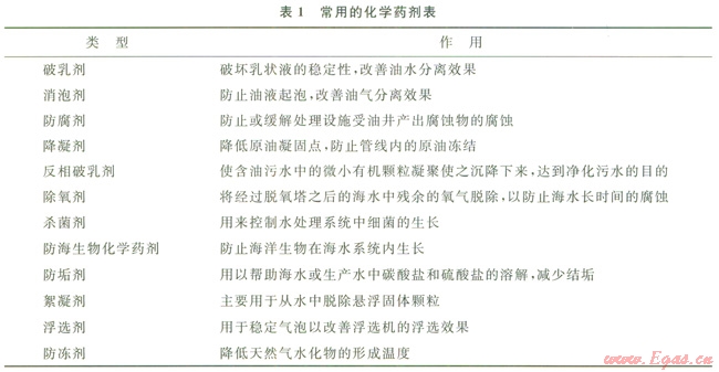 海上油氣田的開發(fā)都離不開化學(xué)藥劑,這些藥劑主要用來添加到生產(chǎn)流體、海水等介質(zhì)中,以此來提高各有關(guān)處理設(shè)備的處理效率,保護(hù)設(shè)備與井口管線,以及延長設(shè)備的使用壽命等。常用的化學(xué)藥劑如表1所示。