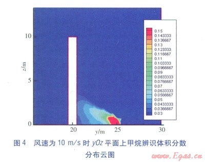 不同風速下yOz平面上甲烷辨識體積分數(shù)分布云圖(視線方向為x軸負方向)見圖2~4。由圖2可知,當風速為1m/s時,障礙物迎風面危險體積分數(shù)范圍分布在7~10m高度范圍內(nèi)。當風速為5m/s時,分布在0~5m高度范圍內(nèi)。當風速為l0m/s時,分布在0~3m高度范圍內(nèi)。