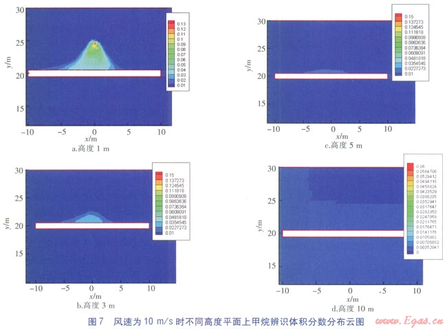 由圖7可知,當風速為10m/s時,在z=1m平面上,障礙物近壁面甲烷辨識體積分數(shù)聚積寬度達到18m,但危險體積分數(shù)范圍分布高度明顯下降,在z=5m處已觀測不到危險體積分數(shù)范圍,分布高度在z=3m以下。