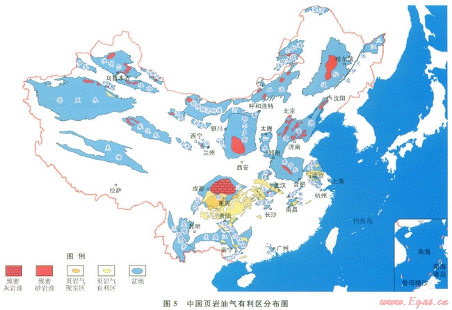 綜合分析認(rèn)為:我國四川盆地及其周邊構(gòu)造相對穩(wěn)定,地表條件良好,下寒武統(tǒng)筇竹寺組、上奧陶統(tǒng)五峰組和下志留統(tǒng)龍馬溪組頁巖,均發(fā)現(xiàn)火山灰層,有機(jī)質(zhì)豐度高、含氣量較高、埋深適中(1000~4500m),為海相頁巖氣現(xiàn)實(shí)勘探領(lǐng)域。我國西部準(zhǔn)噶爾、三塘湖等盆地的中二疊統(tǒng),中部鄂爾多斯盆地上三疊統(tǒng),北部酒泉、銀額、民和、二連、海拉爾等盆地的侏羅—白堊系、東部松遼、渤海灣、南華北、蘇北、江漢等盆地的白堊系和古近系,火山灰層發(fā)育,有機(jī)質(zhì)豐度高,埋深適中(1000~4000m),為頁巖油(致密油)有利勘探領(lǐng)域(圖5)。