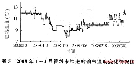 為保證該管線冬季不發(fā)生水合物堵塞,從2007年11月27日開始,作業(yè)區(qū)采用緩蝕劑加注泵間歇式加注乙二醇,每間隔2h加注1次,每次加注30min,每天加注50kg左右;該生產(chǎn)期間,平均氣溫為9.37℃,管線末端輸氣溫度在10~12℃。從2008年1月4日開始進(jìn)行動力學(xué)抑制劑GHI-1現(xiàn)場試驗,采用連續(xù)式加注,白天(8:00~20:00)泵排量為21%,晚上(20:00~8:00)泵排量為25%,每天藥劑加量控制在13~16kg。此期間平均氣溫降至0~5℃,最低氣溫達(dá)-3℃,管線末端輸氣溫度在8~10℃。生產(chǎn)和試驗期間,藥劑加注量如圖3所示,管線輸氣量、首末兩端壓差、輸氣溫度等生產(chǎn)運(yùn)行情況見表2和圖4、5所示。