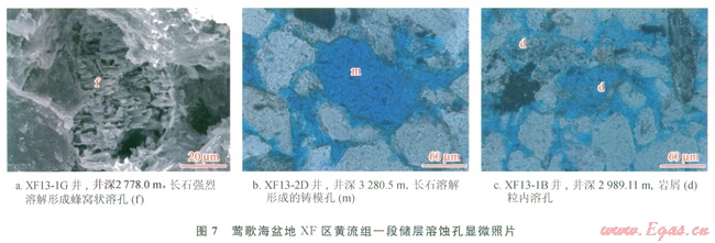 上述分析表明,XF區(qū)黃流組一段儲(chǔ)層除沉積相、成巖作用影響外[4],與物源區(qū)有密切關(guān)系的碎屑組分也是影響儲(chǔ)層質(zhì)量的一個(gè)關(guān)鍵因素。這是由于巖石在深埋過程中,石英組分穩(wěn)定,不易被酸性流體溶蝕,而長(zhǎng)石、巖屑等不穩(wěn)定組分容易發(fā)生溶解,形成各種溶蝕孔(圖7),增加了儲(chǔ)集層孔隙性,同時(shí)因溶解作用強(qiáng)烈時(shí)形成伸長(zhǎng)狀孔、超大孔可改造孔隙的連通性,提高儲(chǔ)集層滲透率[4]。