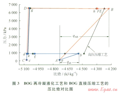 對比2種工藝的能耗,以氣源型LNG接收站為例進(jìn)行分析,繪制出2種工藝的壓比焓圖(圖3)。