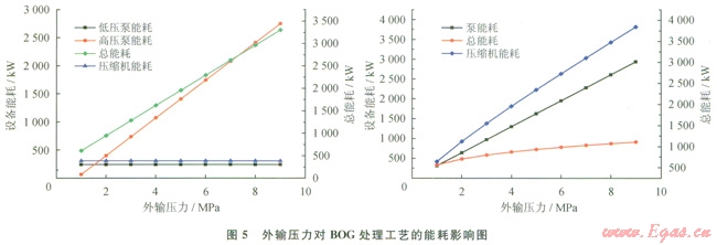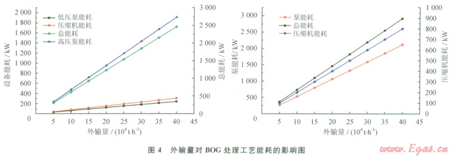 1)BOG再冷凝液化工藝的能耗均小于BOG直接壓縮工藝的能耗。針對2種BOG處理工藝,外輸量的改變幾乎不影響再冷凝器的節(jié)能效果,但當(dāng)BOG量較大時(shí),BOG再冷凝液化工藝的節(jié)能效果更顯著。