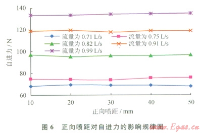 噴距是高壓水射流技術(shù)中的一個(gè)重要參數(shù),正向噴距是指射流鉆頭前端面與井底之間的距離。如圖6所示,在實(shí)驗(yàn)條件下,選取正反流量比為2/3的射流鉆頭作為研究對(duì)象,井筒直徑選取49mm,隨著正向噴距的增大,在同一流量下射流鉆頭產(chǎn)生的自進(jìn)力變化不大,基本持平。以流量為0.91L/s時(shí)為例,噴距為10mm時(shí),自進(jìn)力為ll8.7N;噴距為20mm時(shí),自進(jìn)力為ll9.6N;噴距為30mm時(shí),自進(jìn)力為ll7.8N;噴距為40mm時(shí),白進(jìn)力為ll8.9N;噴距為50mm時(shí),自進(jìn)力為ll9.1N。這主要是因?yàn)樯淞魉a(chǎn)生的反沖力大小僅與噴嘴出口處流速有關(guān),與接觸靶物時(shí)的速度無(wú)關(guān),故反沖力大小與正向噴距無(wú)關(guān),同時(shí)井筒直徑大小不變,改變正向噴距并不影響反向射流的降壓效應(yīng),所以正向噴距對(duì)自進(jìn)力的影響不大。在實(shí)驗(yàn)條件下,井筒直徑為49mm,排量范圍為0.71~0.99L/s,噴距從10mm增加到50mm時(shí),正反流量比為2/3的射流鉆頭所產(chǎn)生的白進(jìn)力范圍為67.8~135.2N。