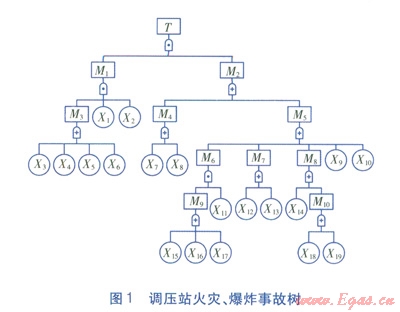 事故樹分析法作為一種工程系統(tǒng)可靠性分析與評(píng)價(jià)的有效方法,可快速、全面、形象、簡(jiǎn)明地分析各種影響因素的相互關(guān)系,為分析調(diào)壓站火災(zāi)、爆炸事故原因提供了有效手段[2-6]。本文對(duì)事故樹分析法在調(diào)壓站事故原因分析的應(yīng)用進(jìn)行探討。