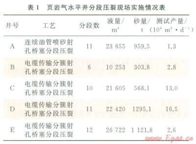 自主技術(shù)先后在四川油氣田長寧威遠(yuǎn)國家級頁巖氣示范區(qū)進(jìn)行了5口水平井的分段壓裂改造實(shí)踐。從應(yīng)用情況看,所有技術(shù)或工具能夠滿足頁巖氣水平井分段壓裂的需求,應(yīng)用效果良好(表1)。