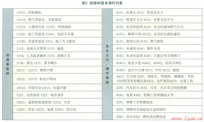 針對城市中高壓燃氣管道泄漏、火災爆炸災害事故,利用故障樹方法可對災害事故場景各階段的發(fā)生原岡進行分析,圖8為泄漏故障樹,圖9為發(fā)生爆炸、火災事故故障樹。將故障樹中基本事件列入表2。為了更為簡潔的繪制故障樹,用“代碼”來表述各影響因素, “代碼”與頂上事件相對應。