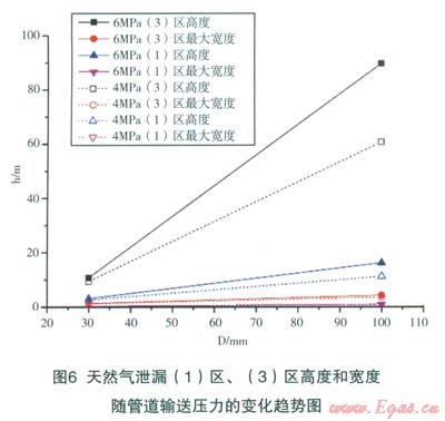 DN900在運行壓力6.0MPa,輸氣能力為74.3萬m3/h的高壓天然氣輸送管道(管壁厚度l0mm),埋地深度1.2m,泄漏點孔徑30mm時,天然氣泄漏口速度較大,屬超聲速天然氣氣流在空氣中的射流擴散,因此,在高度方向的擴散遠大于在水平方面的擴散。如圖4所示,在泄漏5s時,天然氣高度已達150m;25s天然氣已擴散至大于250m的高空;50s其在250m下的空間擴散形狀趨于定常,即形狀隨時間推移基本一致。圖5給出了泄漏口l00mm、30mm條件下天然氣泄漏(1)區(qū)、(3)高度和寬度隨輸送壓力的變化曲線圖。從模擬計算結果可以看出,隨著輸送壓力的增大,在相同泄漏口條件下,泄漏天然氣流量增大,導致(1)區(qū)、(3)高度和寬度增大。圖6給出了天然氣泄漏(1)區(qū)、(3)高度和寬度隨泄漏口直徑的變化趨勢圖,圖中表明:在相同輸送壓力下,泄漏口直徑增大,相當于泄漏天然氣流量增大,導致(1)區(qū)、(3)高度和寬度增大。