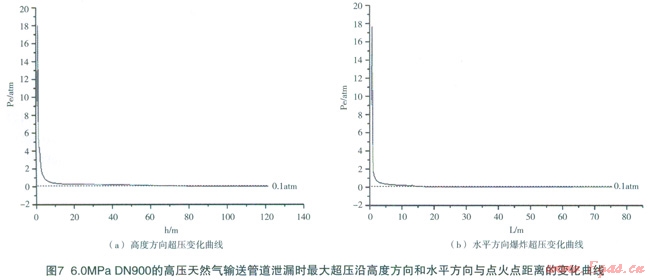 泄漏天然氣發(fā)生燃燒爆炸時,爆炸氣云將形成巨大破壞作用的爆炸超壓,當超壓0.1atm時,就可造成橋梁、救生艇等破壞;當超壓0.35atm時,可以將戶外人員吹走或埋入廢墟,具有50%的致命率,可嚴重破壞建筑物或工廠。通常以超壓0.1atm作為危險的臨界條件。圖7給出了DN900運行壓力6.0MPa,輸氣能力為74.3萬m3/h的高壓天然氣輸送管道泄漏點孔徑100mm,泄漏時間10min條件下,氣云爆炸最大超壓隨高度以及水平距離的變化曲線。圖中計算結果表明:在初始點火后,迅速形成爆轟,并達到約l8atm的超壓;隨著高度的增加,超壓先明顯衰減,隨后緩慢衰減,大約距地面66.5m高度超壓衰減至0.1atm。水平方向,在點火點附近,由于爆轟的存在,超壓高至約l8atm左右;隨著遠離點火點,超壓也是先明顯衰減,隨后緩慢衰減,在距離點火點l5.6m處,超壓降至0.1atm。