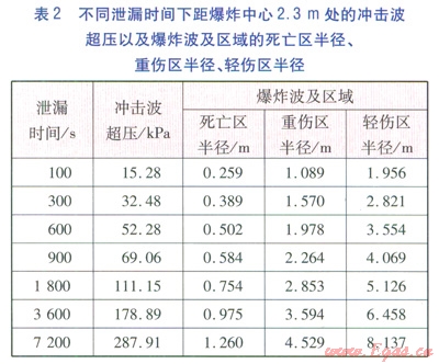 取環(huán)形縫隙泄漏流量為7.882×10-4m3s規(guī)格為l5mm的燃氣管道[8],泄漏時間分別取l00、300、600900、1800、3600、7200s。例:2.3mDp=52.28kPa,Dp=44kPa>2.3m。沖擊波、爆炸波及區(qū)域破壞半徑采用不同方法計算,前者采用式(3)(4)計算,后者采用式(5)(7)計算。不同泄漏時間下距爆炸中心2.3m(內(nèi)墻位置)的沖擊波超壓以及爆炸波及區(qū)域的死亡區(qū)半徑、重傷區(qū)半徑、輕傷區(qū)半徑見表2。