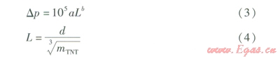 距爆炸中心d處的沖擊波超壓Dp的計算式為: